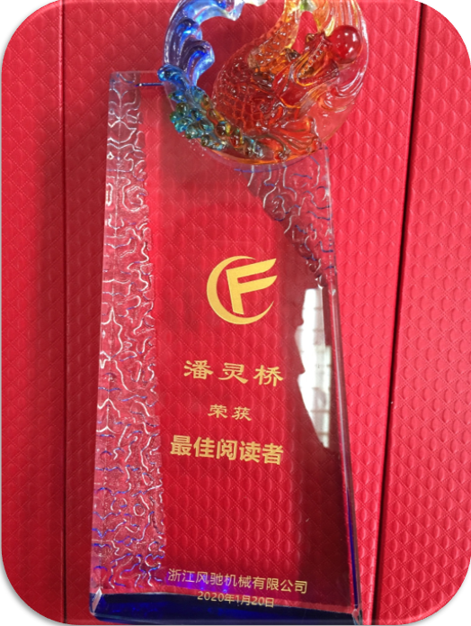 通過對四個季度最佳及優秀心得匯總,經公司領導層最終評選生產部潘靈橋為2019年度“最佳閱讀者”,并授予該榮譽獎杯。